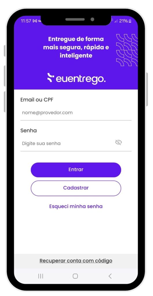 Pronto, agora você já pode fazer o Login e acessar o aplicativo da Eu Entrego.