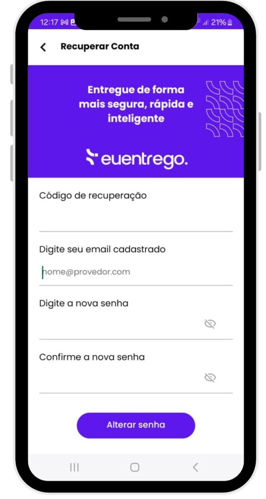 Com o código de verificação em mãos, preencha os campos: “Código de recuperação recebido por e-mail”, “Digite a nova senha” e “Confirme a nova senha”. Para finalizar, basta clicar em “Alterar”.