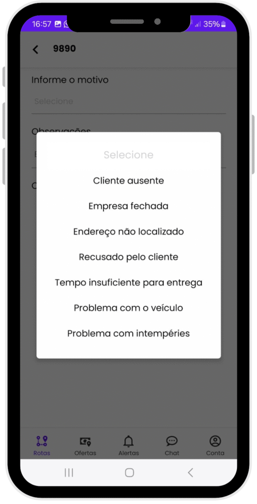 Passo 2 : selecione o motivo, como cliente ausente, endereço não localizado ou recusa do cliente e etc.