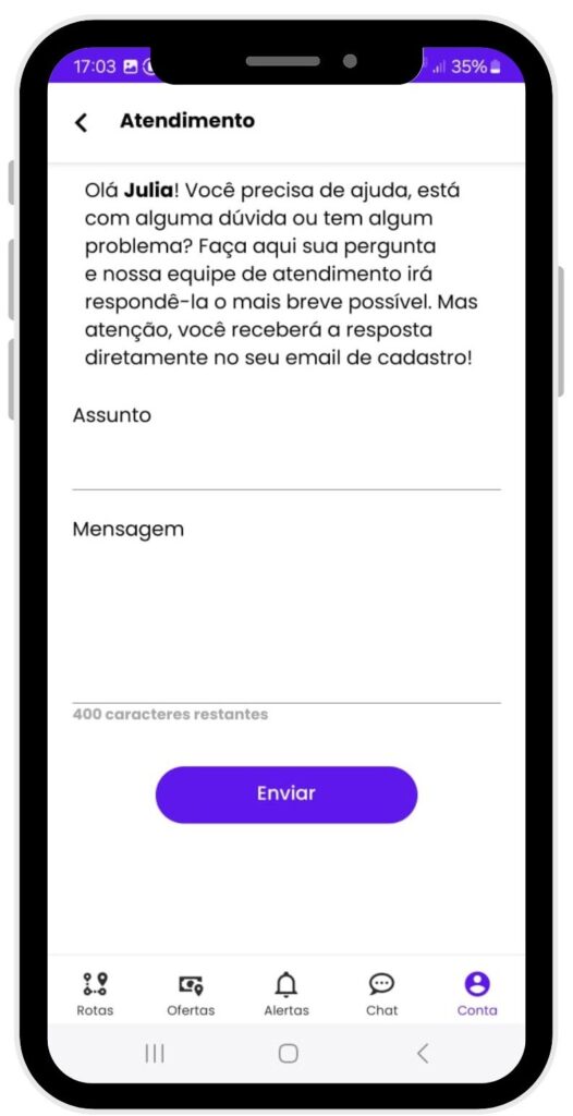Outra forma prática de acionar o suporte é abrir um chamado pelo próprio app. Essa opção organiza a sua solicitação e permite acompanhar o andamento até a resolução.